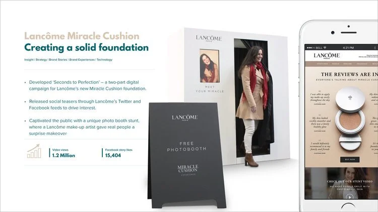 Launch Miracle Cushion was a new compact liquid foundation to 25-40 year olds. In today's world, there are many moments where women want to look good in a hurry. To celebrate the product launch we created a series of visual assets to kick start the social campaign, that showed how women are only ever seconds away from perfection. This then lead to a bespoke social event where individuals and duos could have a surprise mini makeover in what looked an ordinary photobooth.